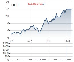 Vốn là một cổ phiếu có thanh khoản thấp nhưng vào phiên giao dịch ngày 31/08, cổ phiếu OCH của CTCP Khách sạn và Dịch vụ Đại Dương bất ngờ khớp lệnh hơn 20 triệu cổ phiếu. Trước đó, OCH đã ghi nhận 1 tháng tăng giá khi đi từ mức giá dưới 6.000 đồng lên đến 12.000 đồng như hiện tại.